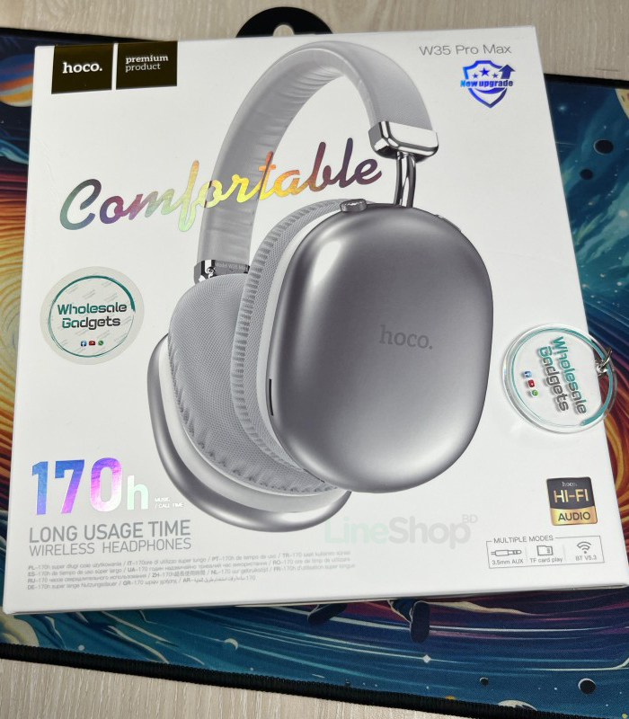 Hoco Wireless Headphone – 170 ঘণ্টা ব্যাটারি ব্যাকআপ, Bluetooth 5.3, 40mm HD স্পিকার, TF ও AUX সাপোর্টসহ দীর্ঘ সময় ব্যবহারের জন্য পারফেক্ট একটি প্রিমিয়াম হেডফোন।